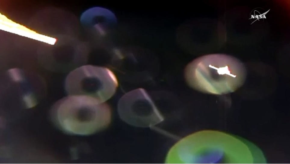 As the video progresses the items appear to turn slightly and light up while keeping the same orbital speed as the space station.
