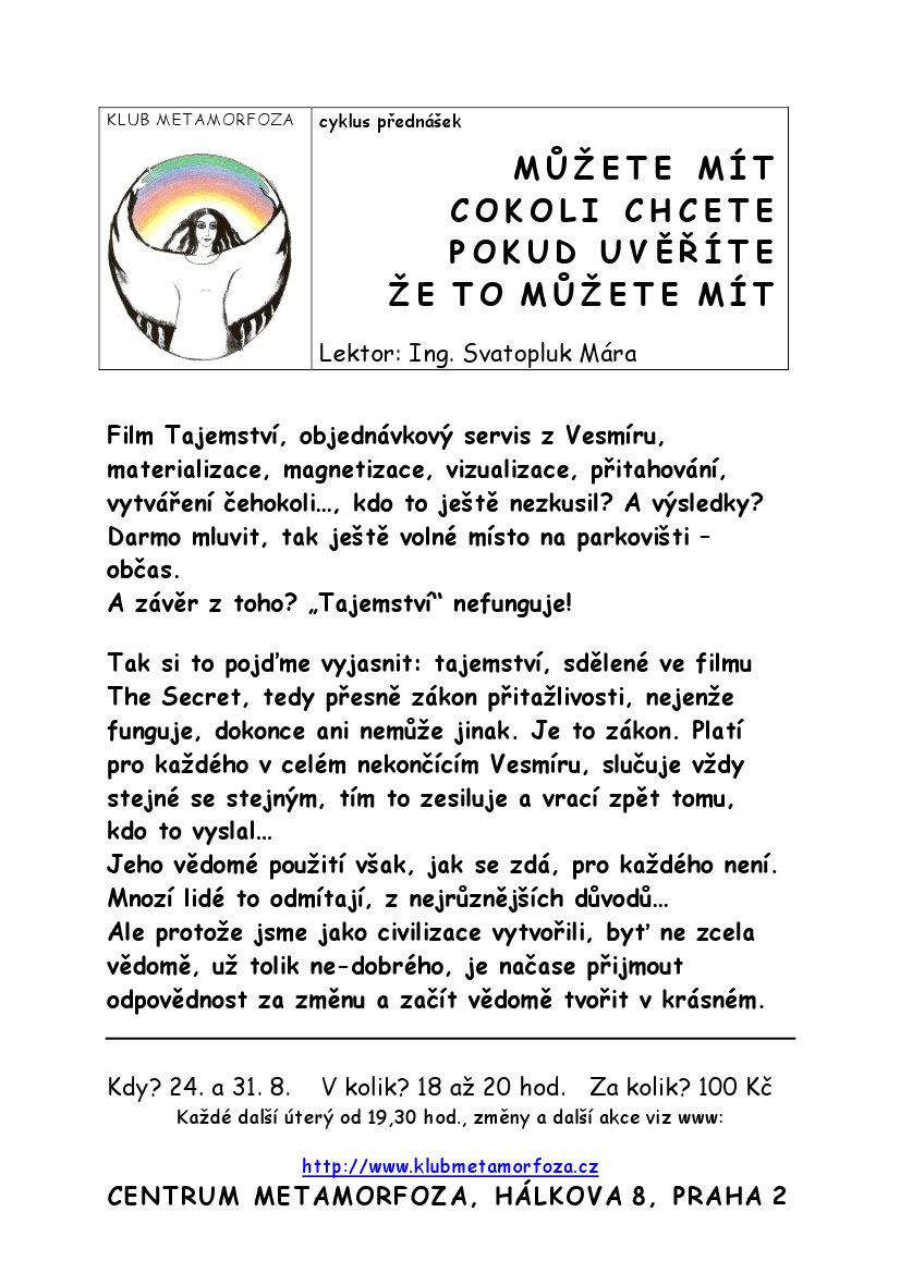 internet je plny roznych vykladacov tajomstva a zakona pritazlivosti, ktori za symbolicky poplatok prezvykaju opet a znova to iste a tisic krat povedane, ale ak je toto ich jediny sposob zarobku ( alebo jeden z mala ), v tom zmysle, ze si za to musia pytat tych par smiesnych zlatakov tak dakujem pekne