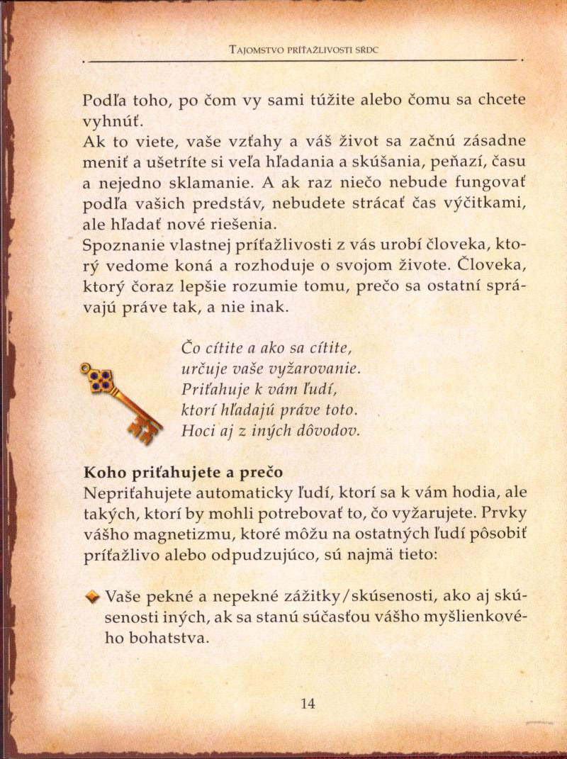 Ukážka textu z knihyNič v živote nie je náhoda Ľudia a príhody v našom živote sa neobjavujú náhodou. To, ako jednotlivé vzťahy vznikajú a vyvíjajú sa, nemá nič spoločného so šťastím alebo so smolou. Príčinou všetkého, čo sa v nás odohráva, je určitá sila. Tá spája nás všetkých. Má vplyv na to, či jeden druhého nájdeme, alebo nie. Je pôvodcom toho, čo cítime a ako sa správame. A rozhoduje o tom, či vznikne láska. Keď tejto sile porozumieme a vedome ju formujeme, bude v našom živote priťahovať presne tých ľudí a javy, po ktorých túžime.