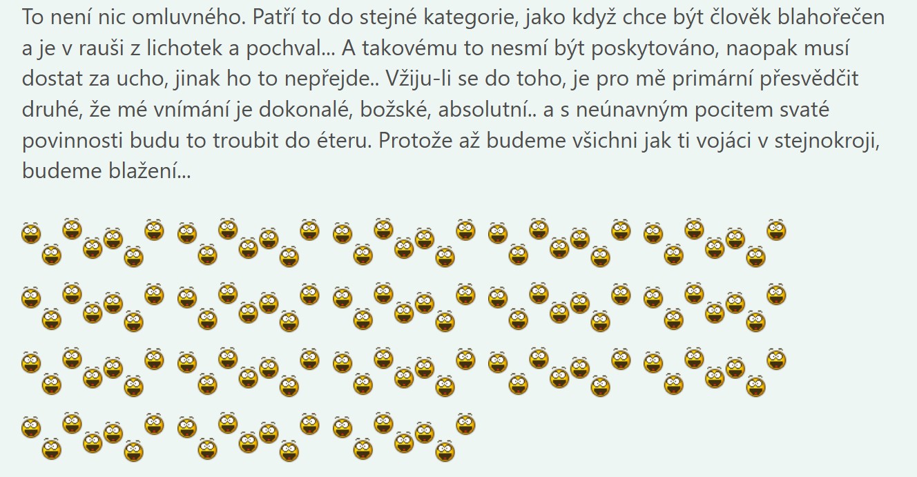 To není nic omluvného. Patří to do stejné kategorie, jako když chce být člověk blahořečen a je v rauši z lichotek a pochval... A takovému to nesmí být poskytováno, naopak musí dostat za ucho, jinak ho to nepřejde.. Vžiju-li se do toho, je pro mě primární přesvědčit druhé, že mé vnímání je dokonalé, absolutní, a s neúnavným pocitem svaté povinnosti musím to troubit do éteru. Protože až budeme všichni jak ti vojáci v stejnokroji, budeme blažení.