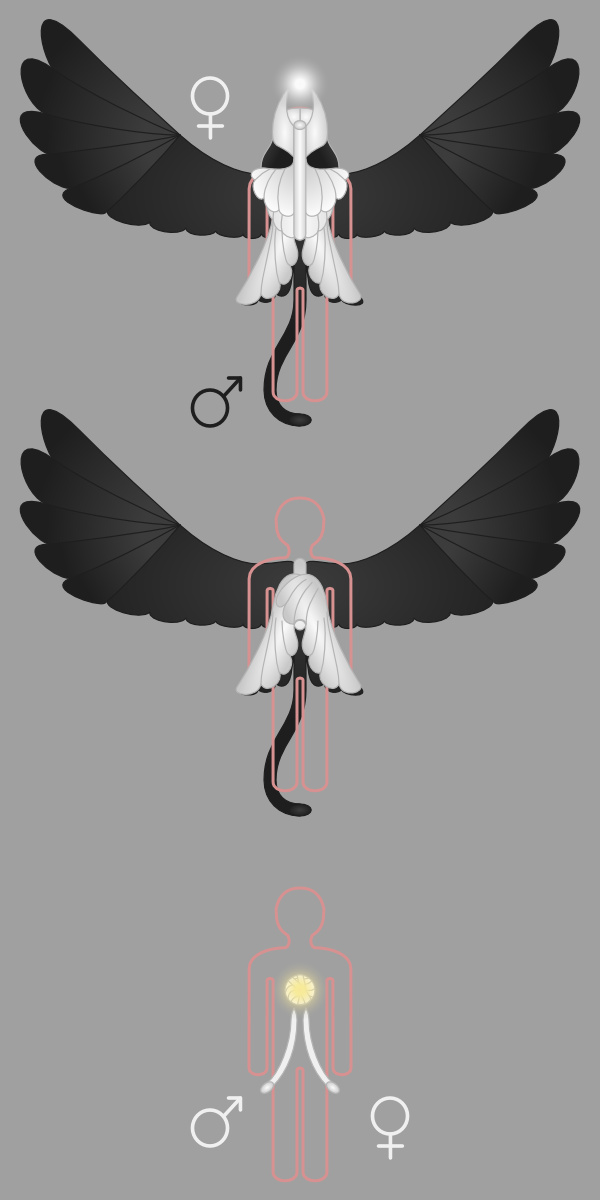 Okřídlené hadí tělo, kterým teď jsem, je takový chuchvalec připomínající obrovskou hlavu s velkýma očima a hadem jako dlouhým jazykem s funkcí penisu. Háďata při porodu hlavě jakoby lezou z pusy. Podoba odpovídá tomu, jak australští domorodci zobrazovaly své stvořitele světa, kterým říkají duchové Wandžina. Tihle duchové vypadají stejně jako známí šedí mimozemšťané z únosů do ufo. Tady je obrázek z roku 2014. Úplně neodpovídá (velká černá křídla jsou menší a ocas není tak dlouhý). Prostřední obrázek je jakoby řez.